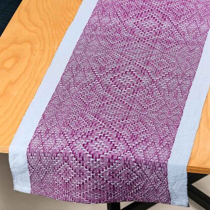 This intriguing runner uses three distinct styles of huck lace in one undulating pattern to add dimension and interest to your table. With “tromp as writ” treadling and opposing floats in Magenta and Celestial Blue, this runner in Valley Yarns 10/2 Cotton is sure to catch the eye!