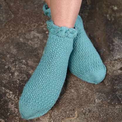 Valley Yarns Beachside Socks, with their pebbly surface and beaded cables reminiscent of turning waves, bring to mind soft, hazy evenings at the beach. These socks are knit toe-up two at a time. The stitch pattern is charted and written out.