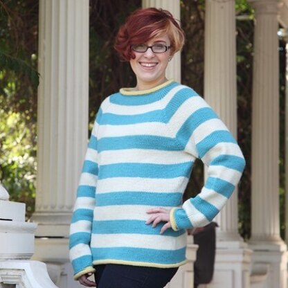 Bright and cheerful stripes make the top-down, funnel-neck, raglan Big Sky Pullover a cute part of your cold weather wardrobe. The contrasting color on the rolled hems adds a special touch and visual interest.