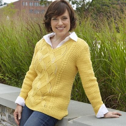 Valley Yarns Thatch Pullover features a stunning combination of classic cables, textured lace panels, and shining, golden color using Colrain. The shape of the v-neck is built into the natural chevron-shapes of the front lace panel. The sweater is knit in pieces from the bottom up with flattering, textured set-in sleeves. Valley Yarns Colrain is a dream to work with! Tencel® adds a lovely luminosity to your work while enhancing the yarn’s durability making it perfect for this women’s sweater.
