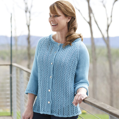 Valley Yarns Deauville Cardigan is a top-down women's sweater that is knit in Goshen, one of the softest cotton blend yarns you can find. This cardigan features vertical eyelet lace on the fronts and three-quarter length sleeves. The scoop-neck back and sleeves are knit in stockinette stitch with eyelet borders. The Deauville Cardigan is the perfect antidote to an unexpectedly cool summer evening. This knitting pattern is suitable for intermediate knitters. The eyelet lace pattern is charted and written out.