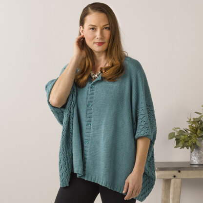 On cool spring evenings, Tanzanite from Valley Yarns is a casual, oversized topper that makes an excellent layering piece knit in Goshen, and is perfect for knitters wanting to try a first lace project. Two rectangles, seamed together to form sleeves, front, and back, make this oversized women’s cardigan a quick and easy project. Valley Yarns Goshen is one of the softest cotton blends you can find. The Modal® and silk not only add a slight sheen but also enhance the durability of this gorgeous yarn. Garments made with Goshen will not pill and will stand the test of time. The lace pattern is charted and written out.