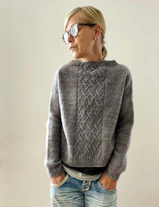 Venia is worked seamlessly from the top down. Starting with the high neck, you then work some short rows to bring the front part of the neck down. Once the short row shaped neck is done, the upper part of the yoke is worked in the round until the final shoulder width is reached. Then both the front and the back are worked (separately) flat to underarm. At underarm both front and back are joined to work the body top down in the round to the bottom ribbing. Sleeve stitches are picked up around the arm openings to work the sleeves in Stockinette stitch top down in rounds to the cuffs.