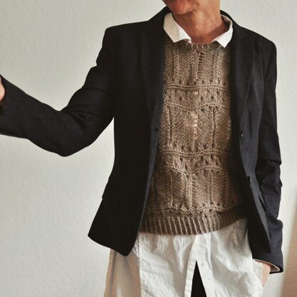 VESTiVE is worked seamlessly from the top down. You start working the back and shape the back neck with short rows. Continue to work the back until the length of the armhole. Then you pick up the stitches for the fronts and work the neckline symmetrically to join the both fronts and work until the length of the armhole. Join back and fronts to work the body in the round down to the bottom ribbing. Pick up the neck sts and then the sleeve sts to work the ribbings.