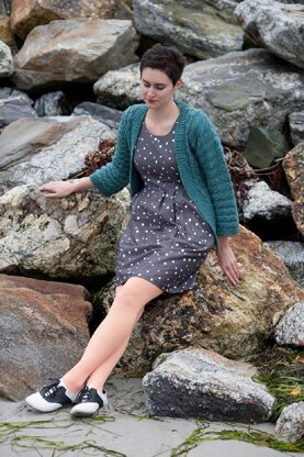 Vinita is an open cardigan with an all-over cable pattern and ribbed trims. The simple cable and rib patterns look clear and crisp in a silk and merino blend yarn.The weight of the yarn and the cable pattern provide an extra bit of warmth that allows this cardigan to be worn through many seasons.