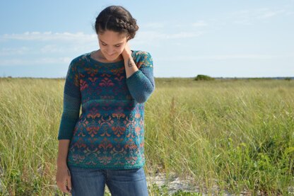 The Vintage Damask Pullover was inspired by the patterns on vintage carpet bags. The design is worked with stranded color work with the front and back being knit flat separately, from the bottom up, and seamed together at the shoulders and sides. The sleeves are picked up and worked outward from the body in the round. Knit up in Spincycle Dyed in the Wool yarn, it is a fun yarn which naturally stripes and has the feel of a hand spun yarn. As you knit your way up the sweater with the main and contrast colors, watch the yarns change, creating a rich tapestry of tones and contrasts and a beautiful overall effect!