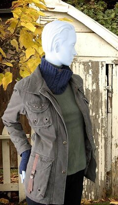 One of my patterns that was originally part of the Patternworks Essential Accessories Club, I’ve reworked the fingerless mitts and added a cowl. Both the cowl and fingerless mitts are begun by working the ribbing back and forth, then joined to continue in the round. The mitts are worked in the round to the end. The cowl is worked in the round to just below the ribbed band at the top, then the ribbing is worked back and forth. Buttons and loops are added for the perfect finishing touch.