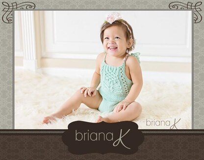 Yarn: Lion Brand Angora Merino Yardage: 65 for Newborn, 115 for 6 month, 127 for 12 month, 150 for 18 month Size: Newborn to 18 months Top of bib to crotch: Newborn: 9 inches; 6 month: 12 ¾ inches; 12 month: 13 ¼ inches; 18 month: 14 inches Width: Newborn: 6 ¾ inches 6 month: 8 inches; 12 month 8 ½ inches; 18 month: 9 inches