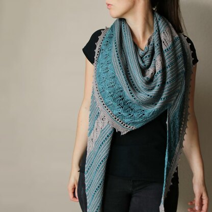 Knit in delicate shades of turquoise and gray that evoke the swirling jungle mist, this shawl combines lush leaf lace panels with garter and eyelet stripes that resemble lined paper in a notebook. The combined effect pays homage both to Dian’s intimate connection to the jungle, and the meticulous notes she took as part of her scientific study. As I designed this shawl, I pictured her bent over her notebook, recording the day’s observations while surrounded by the scents and sounds of the jungle.