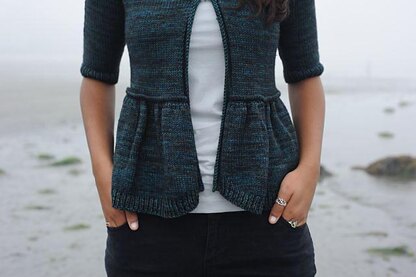 This pattern is from the book Coastal Knits. A top-down cardigan with a well-placed pleat that flatters the waist. Short row shaping at the hem gives creates a slight curve, mimicking the shape of a shore line. With elbow-length sleeves, this a cardigan for all seasons! Yarn: 5 (6, 7, 7, 8)[9, 10, 11, 12] skeins String Theory Hand Dyed Yarn Caper Aran (80% Merino, 10% Cashmere, 10% Nylon; 200 yds / 183m; 31⁄2 oz / 100g) in Skerry OR 950 (1075, 1225, 1375, 1550)[1700, 1875, 2050, 2250] yds / 900 (1025, 1150, 1300, 1460)[1600, 1775, 1925, 2125] m of DK weight wool blend, such as Madelinetosh Merino DK.