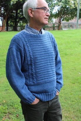 This pullover is knit from the bottom up with knitted-in underarm gussets. The upper chest front and back pieces are divided at the midpoint of the gusset and knit flat separately. Once the upper body is complete, the shoulders are joined with 3-needle bind off. Then the sleeves are knit from the top down from the end of the shoulder join to the ribbed cuff. The collar is knit in the round after the upper body pieces are joined.