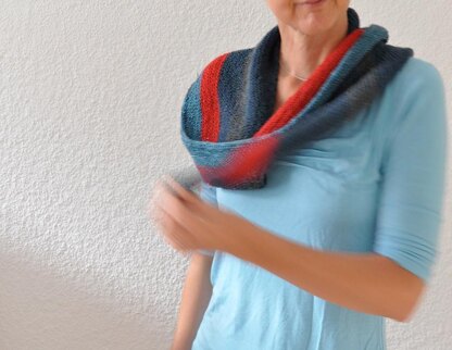 The asymmetric sickle shape works nicely with stripes in contrasting colors as shown in the examples, but is also particularly appropriate for handspun or self-striping yarns.