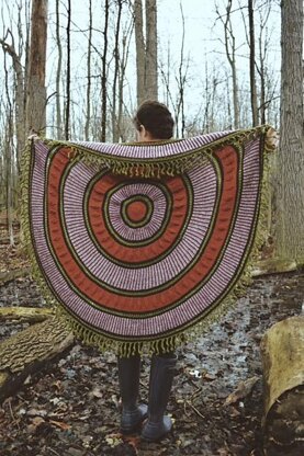 The Wild Mystic Shawl is a large Pi shawl knit from the center out. The shawl features various sections of medallions, 2 color brioche, eyelets and garter ridges with a knit on fringy edging. This shawl is a varied, fun knitting experience with radial increases sections cleverly hidden in with the eyelets! Knit up in earthy rustic tones in Brooklyn Tweed Loft it is a super squishy, warm, bohemian shawl.
