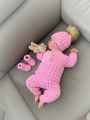 Just as the name suggests "Winter" is a cosy 4 piece set ideal for the winter months and is suitable for either a boy or girl. The knitting pattern provides the instructions to make all 4 pieces of this set, The Jumper is knitted from the top down on straight needles, Trousers, and hat are also knitted in one piece and the little boots will knit up quickly.