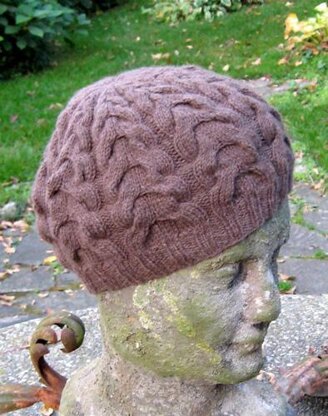 I've always loved this sort of interlocking cable stitch, ever since I was 6 years old and my mom knitted my dad a grey pullover vest with just this kind of cable up the front (picture a 1959 high school chemistry teacher with horned rimmed glasses). It was perfect on my dad's vest, and I think it's equally perfect travelling up a cute cap or beret.