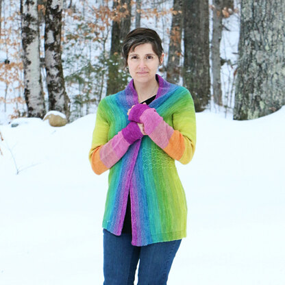 Rainbows in the Gorge is a lightweight cardigan from Wonderland Yarns. This sweater is worked sideways from cuff to cuff with flattering waist detailing and a shawl collar. Wonderland Yarns So Fond Of Rainbows in Cheshire Cat, a set of bright, beautiful mini skeins, gives this garment its amazing gradient color.