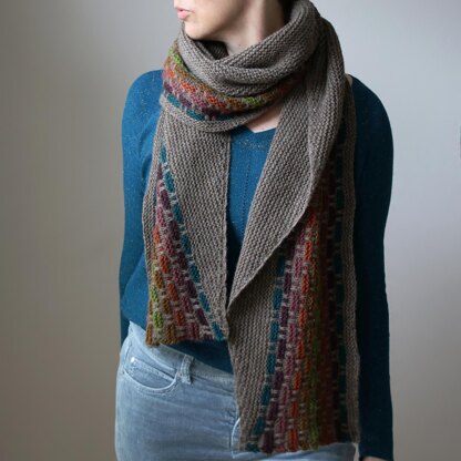 It’s an elongated semi-circular wrap with a cozy garter stitch body and simple colorwork stripes that add a pop of fun. The top-down construction is simple to follow.
