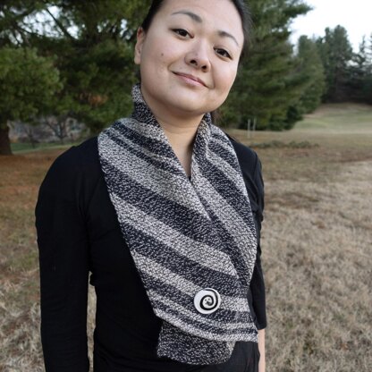 This fun, easy-to-knit project is perfect for beginners and experienced knitters alike. The scarf is knit on the bias with contrasting color garter stitch stripes in varying widths. The bold, graphic pattern is achieved using simple garter stitch, which makes the whole project relaxing and fun to knit!
